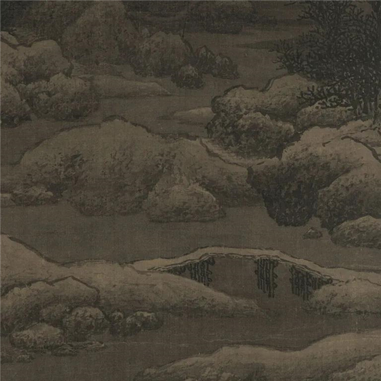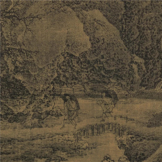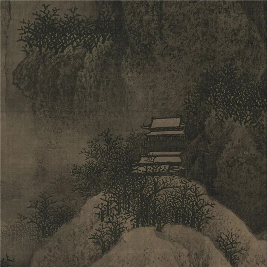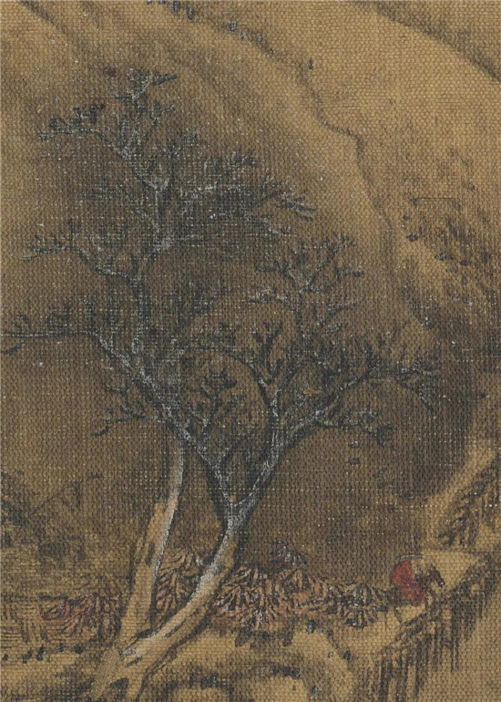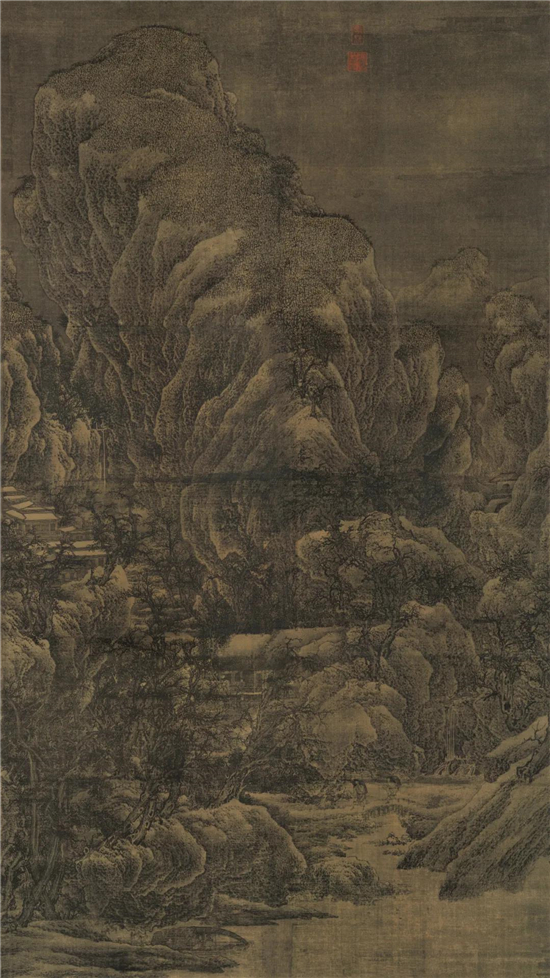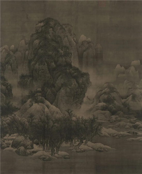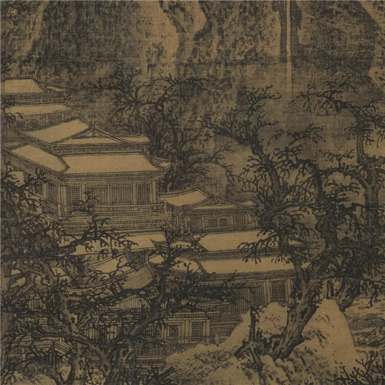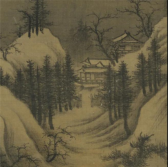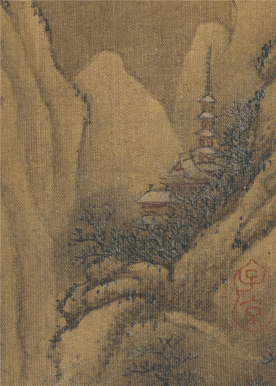 《雪山楼阁图》,现藏于波士顿美术馆。此画与《溪山行旅图》中的商旅有异曲同工之妙,左下渔夫卖鱼,山间小路上的行人冒匆匆赶路,山腰间楼阁殿宇隐现。此画皴法多是雨点皴,画中景抽绘树木,用笔遒劲,姿态各异,为画面平添生气。近处的柏树,笔法极其精彩。主峰作寒林密布,如茸似毯,密而不乱。是一幅非常优秀的宋代精品。