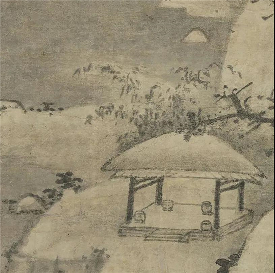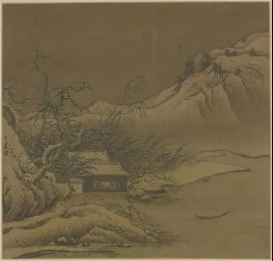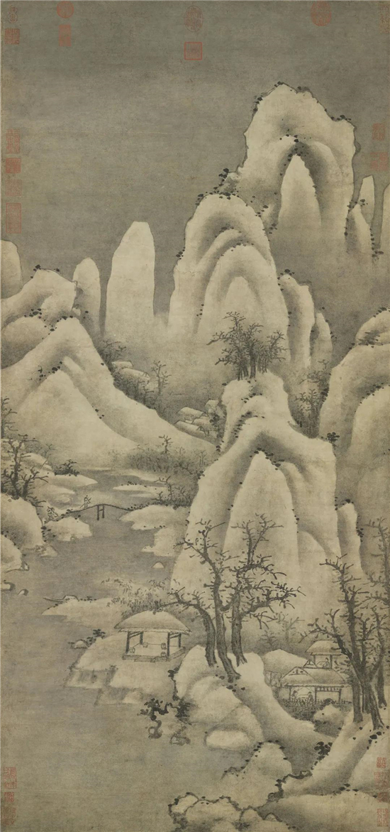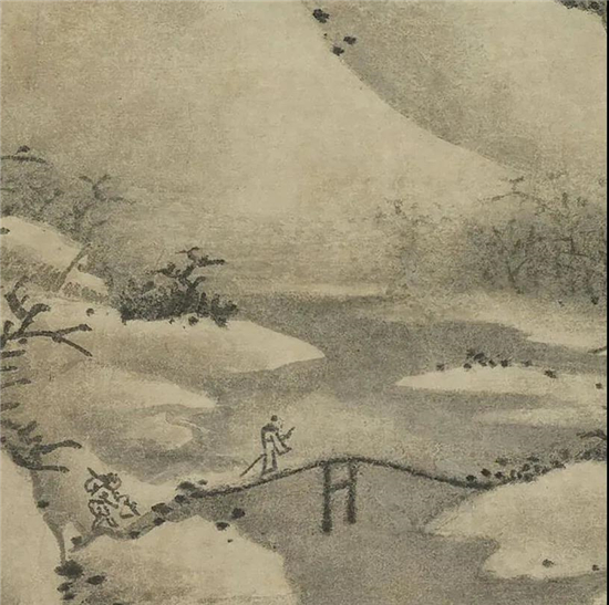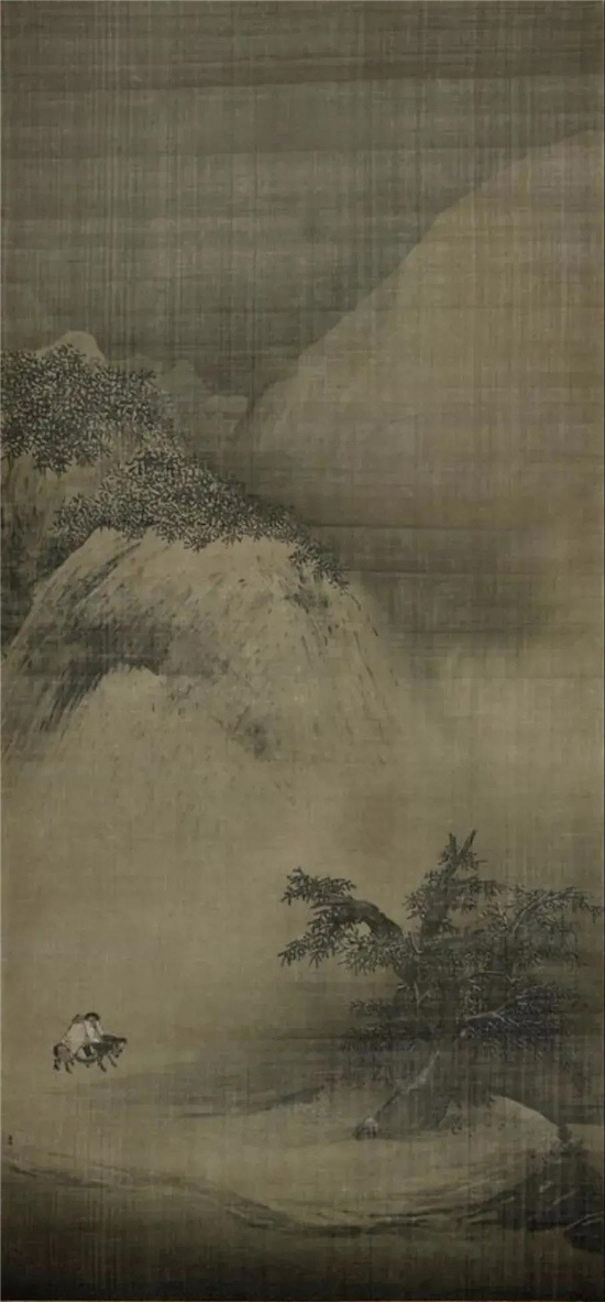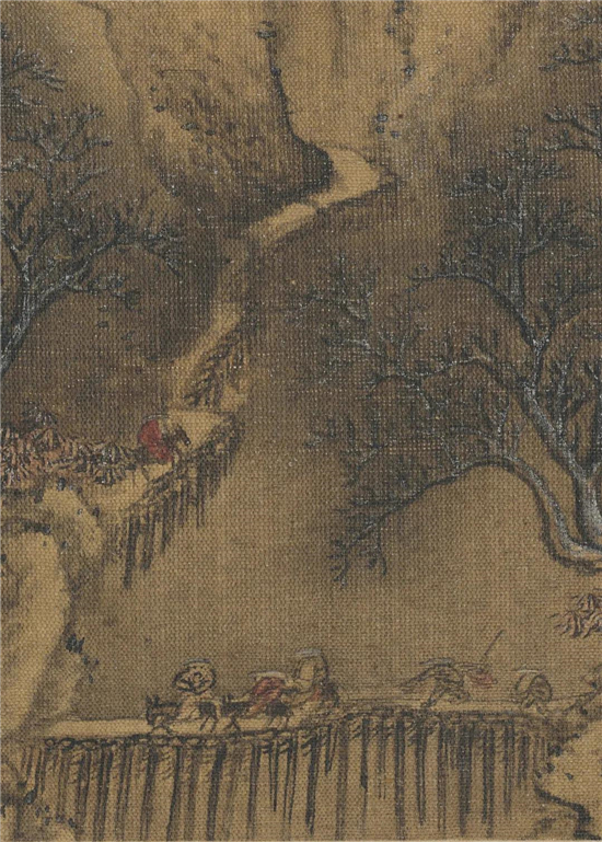 《雪景山水图》梁楷绘,现藏于东京国立博物院。《雪景山水图》堪称南宋院体山水画的经典之作。图中描绘两个身着白色披风、头戴风雪帽的骑驴人穿行山谷的情景。水边两棵老树,其虬曲的枝干和稀疏的树叶,是以细致的笔法刻画出来的。画山石,仿北宋范宽的笔法,以簇点画密林;而山体皴笔甚少,在以淡墨渲染的天空的映衬下,给人以白雪皑皑之感。整个画面呈现出荒凉萧瑟的氛围。在画幅左下角寒溪边缘有“梁楷”的落款。