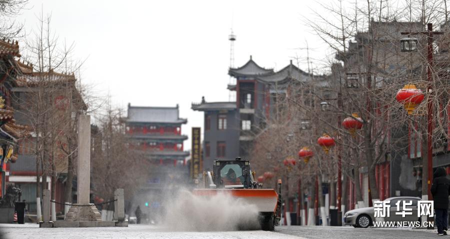 1月13日,一辆除雪车在沈阳故宫外的街道除雪。新华社记者 姚剑锋 摄