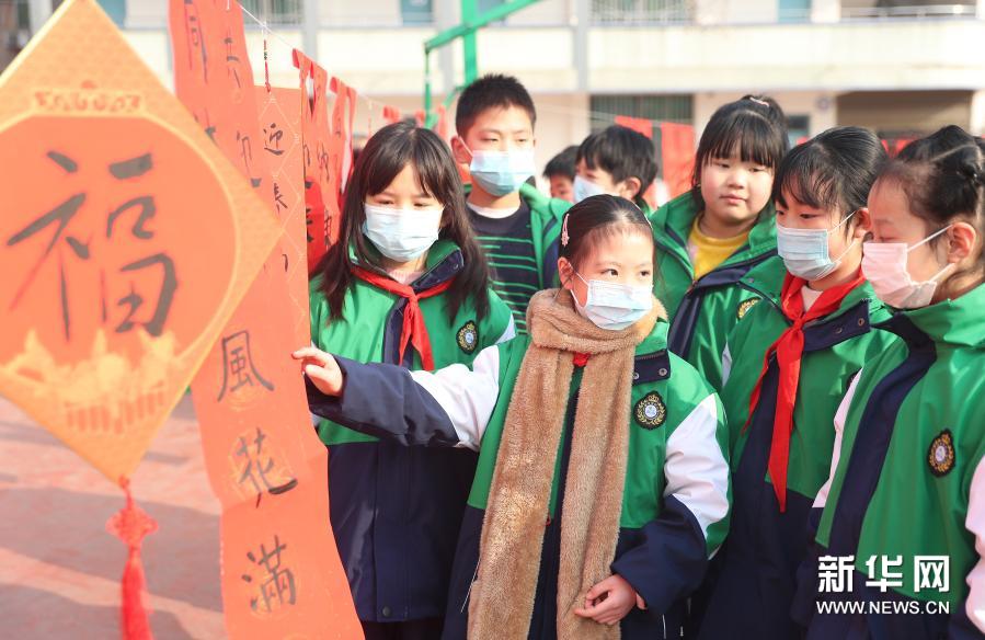 1月14日,四川省华蓥市双河小学学生在向同学介绍自己书写的春联。新华社发(邱海鹰 摄)