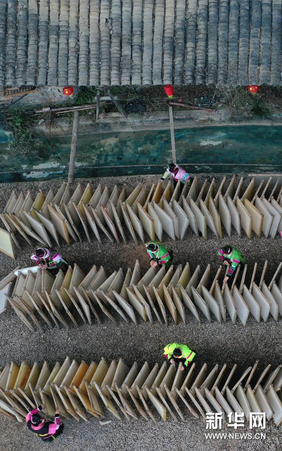 1月14日,村民在贵州省丹寨县南皋乡石桥村古法造纸作坊晾晒白皮纸(无人机照片)。新华社发(黄晓海 摄)