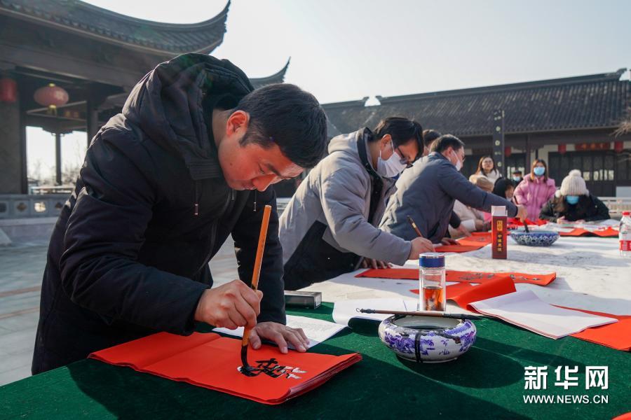 1月14日,书法爱好者在连云港市灌云县同兴镇梅园文化广场为当地居民书写春联。新华社记者 李博 摄