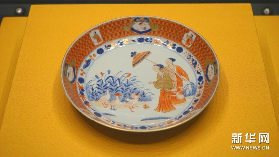 这是展览展出的清乾隆时期的仕女撑伞图盘(1月15日摄)。新华社记者 顾天成 摄