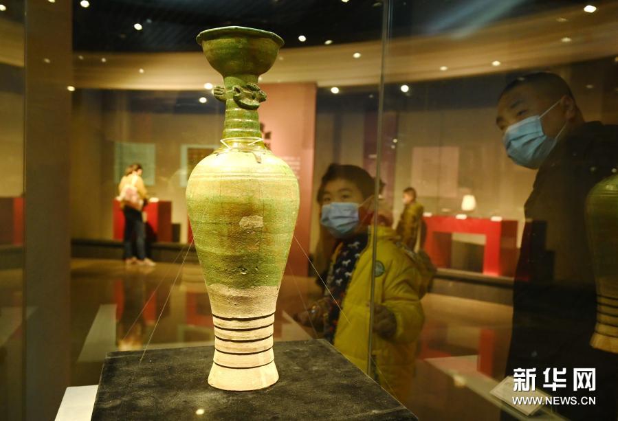 1月17日,观众在观看展出的绿釉凤首瓶。新华社记者 林善传 摄