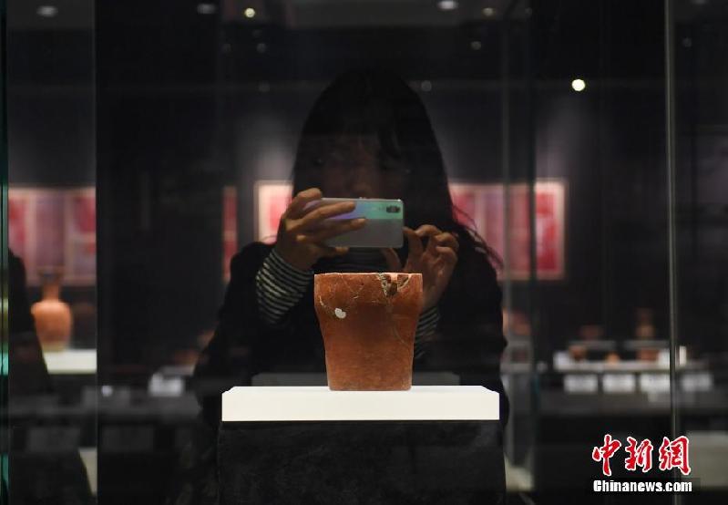 1月15日,浙江杭州,一名参观者在拍摄下汤遗址的陶罐。中新社记者 王刚 摄