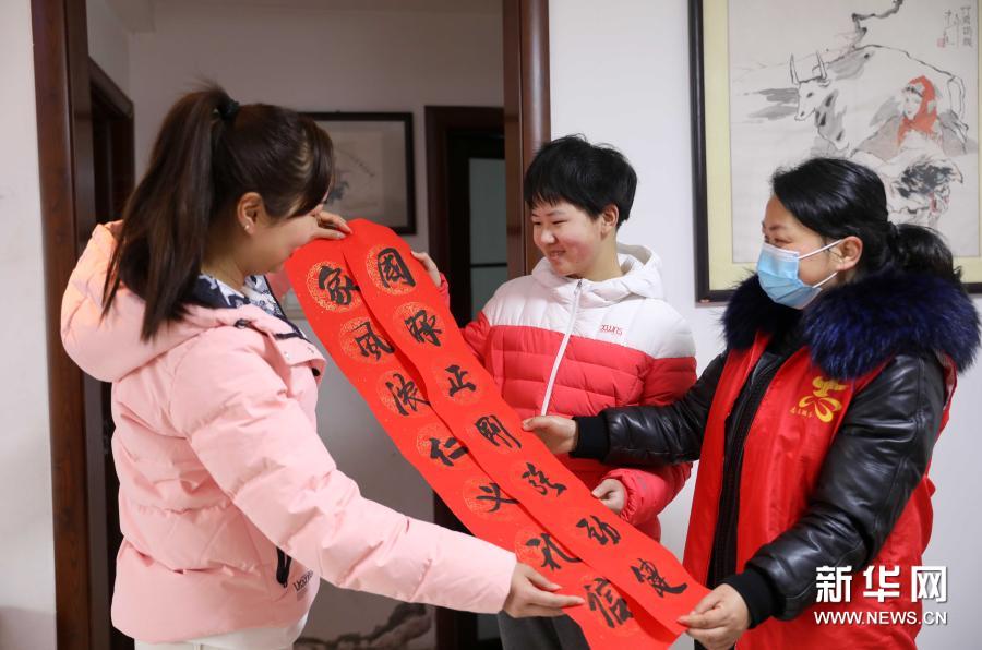 1月27日,社区志愿者将春联送到留在合肥过年的外来务工人员家中。新华社记者 曹力 摄
