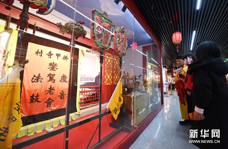 2月2日,傅宝安(左一)通过直播平台给网友介绍津门法鼓(挂甲寺庆音法鼓)的由来。新华社记者 李然 摄