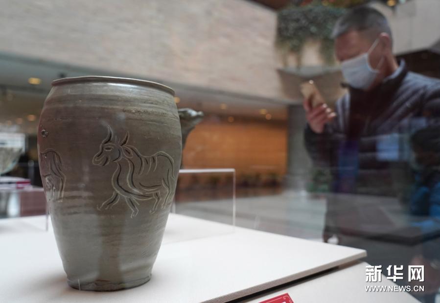 2月4日,观众在上海博物馆参观韩国国立中央博物馆藏高丽王朝时期的文物“青瓷镶嵌牛纹罐”。新华社记者 任珑 摄