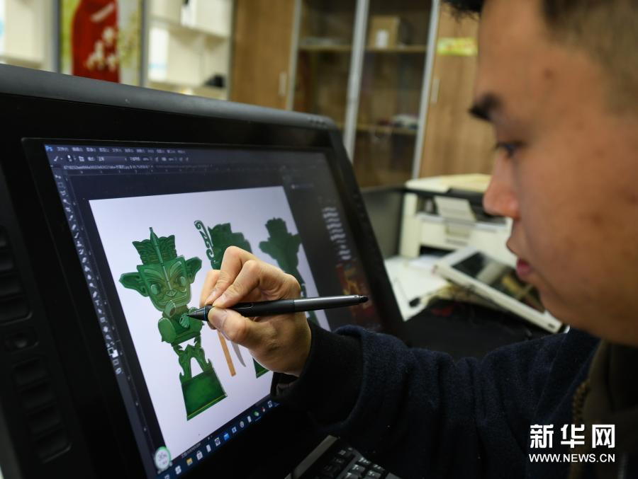 2月4日,在成都市武侯区文里创客园,曾舟在电脑上完善细化三星堆福佑青铜像系列潮玩的设计方案。新华社记者 王曦 摄