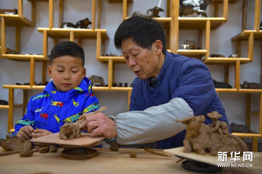 2月9日,贵州省遵义市余庆县民间泥塑艺人黄泽富(右)在教授孙子黄浩然制作泥牛。新华社记者 刘续 摄