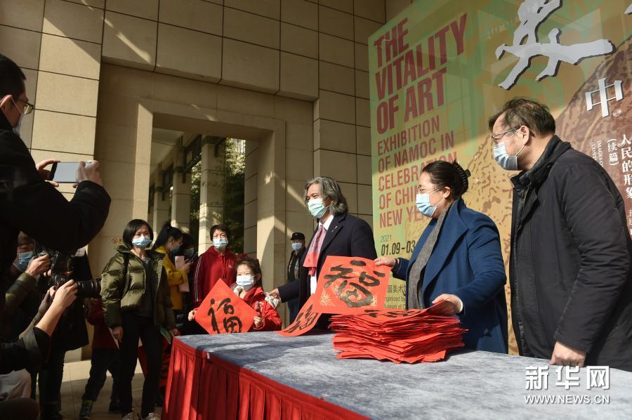 2月12日,中国美术馆馆长吴为山(右三)为观众赠送福字。新华社记者 鲁鹏 摄