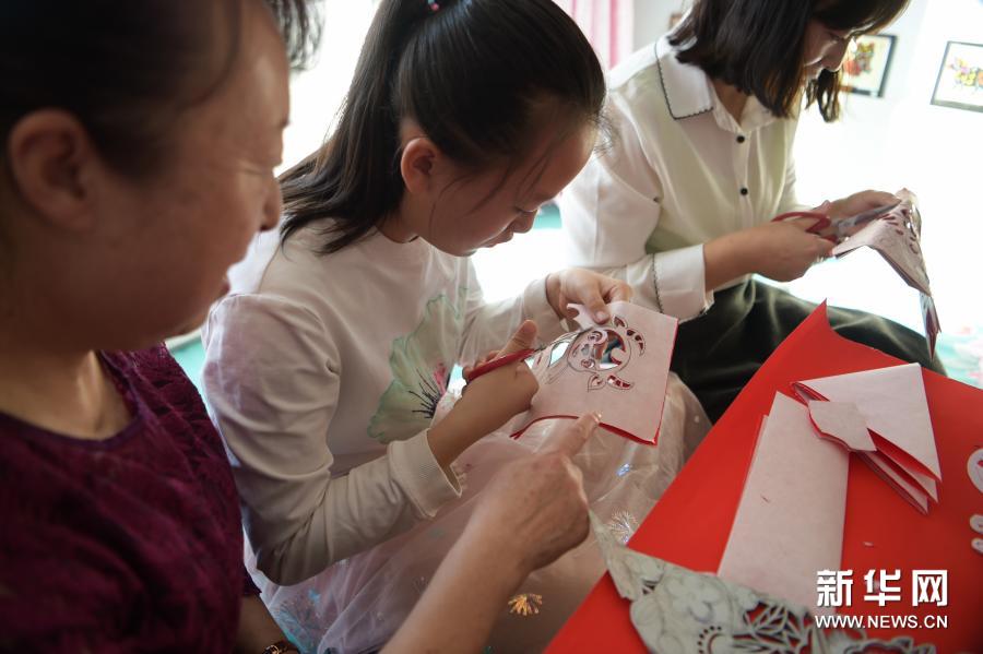 2月21日,在乌海市海南区新桥花园,李华(左)在家中指导外孙女高宇晨(中)剪纸。新华社记者 李志鹏 摄
