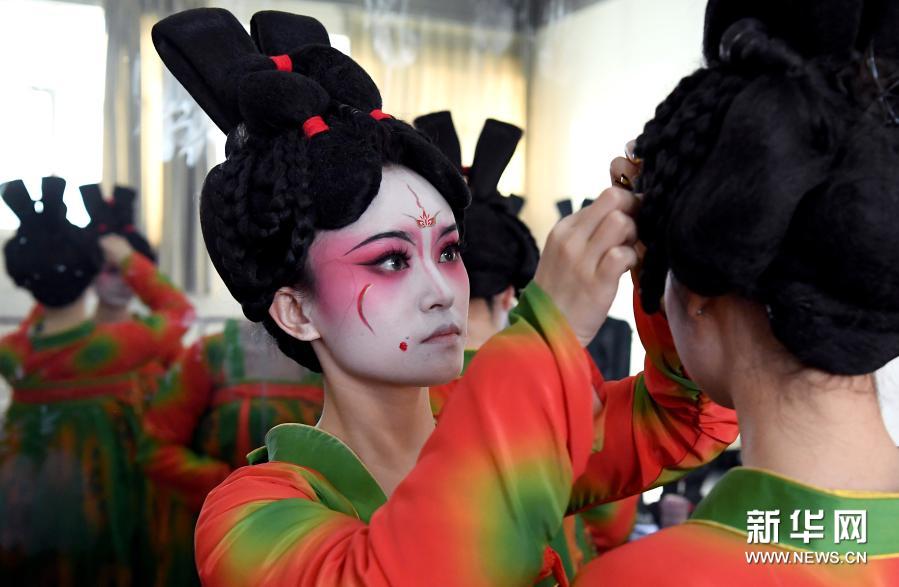 郑州歌舞剧院的演员帮同事整理假发(2月20日摄)。新华社记者李安摄