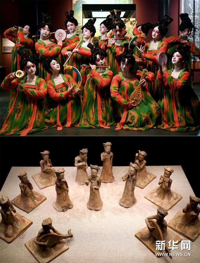 拼版照片:上图为郑州歌舞剧院的演员在录制河南博物院元宵奇妙夜节目(2月20日摄);下图为河南博物院主展馆内展出的展品(2020年9月24日摄)。新华社记者李安摄
