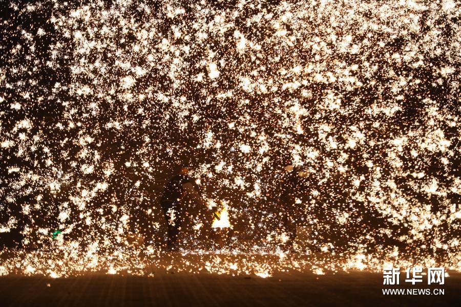 2月22日,在山东省临沂市郯城县郯国古城景区,民间艺人表演“打铁花”。新华社发(张春雷 摄)