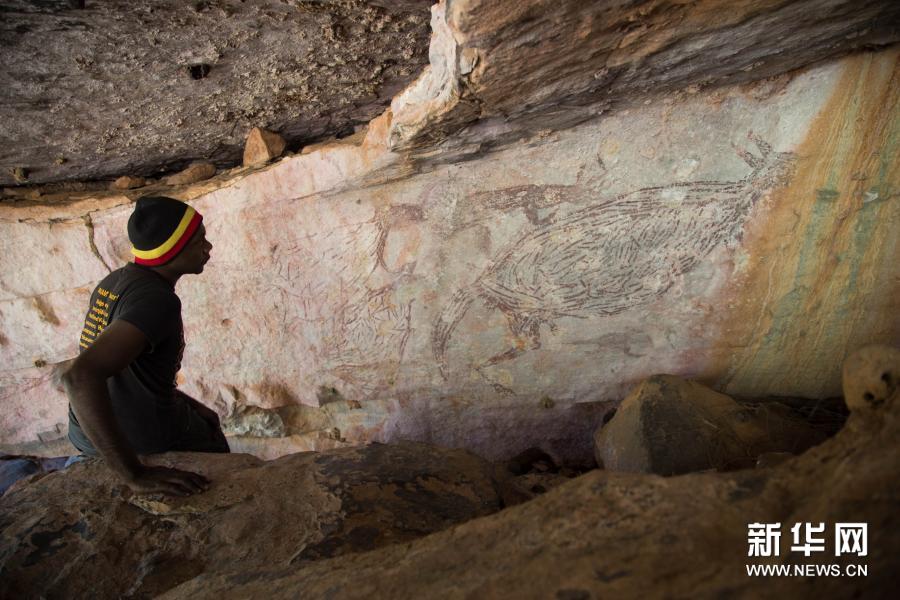 这张2016年7月15日拍摄的资料照片显示,在澳大利亚金伯利地区,一名原住民观看袋鼠岩画。新华社发(彼得·韦斯摄)