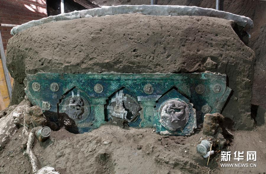 这是1月27日在意大利庞贝古城拍摄的出土的四轮马车局部装饰。新华社发