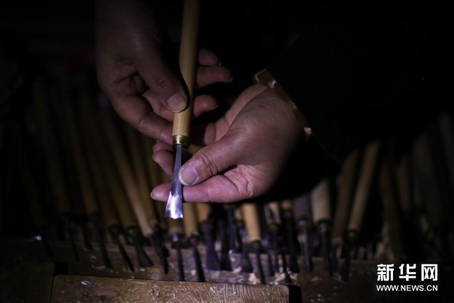 2月28日,在贵州省赤水市石沓沓非遗馆,卢华英在整理刻刀。新华社发(王长育 摄)