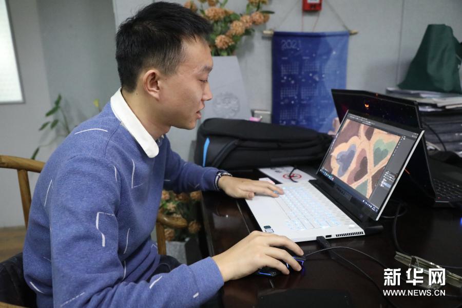 3月9日,在兰州交通大学染缬艺术研究所,工作人员在设计染缬布艺图案。新华社记者 马希平 摄