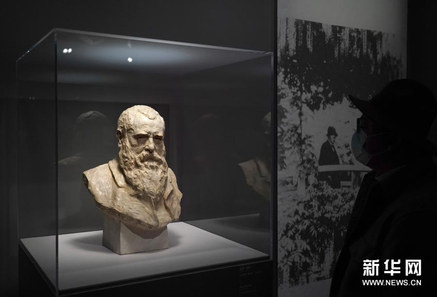 3月17日,观众在“莫奈与印象派大师展”上参观莫奈石膏像。当日,“莫奈与印象派大师展”在位于上海外滩的久事国际艺术中心揭幕。本次展览展出法国玛摩丹莫奈博物馆珍藏的61件真迹,其中包括莫奈的20幅杰作。展览将持续至8月1日。新华社记者 任珑 摄