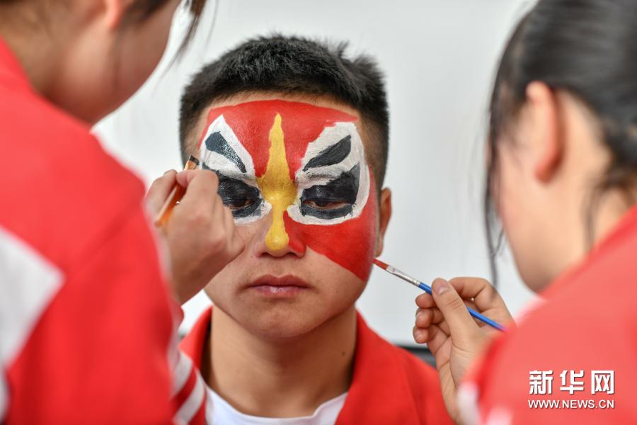 3月23日,贵州省龙里县第三中学学生在排练前画脸谱。近年来,为传承和保护龙里太平花灯戏,贵州省黔南布依族苗族自治州龙里县第三中学将龙里太平花灯戏引入校园,并邀请传承人作为指导老师为学生定期授课。学校还通过组建兴趣班、开设活动课、开展送文化下乡志愿服务等方式,让龙里太平花灯戏这一古老民间戏剧艺术形式得以展示和传承。龙里太平花灯于2019年被列入贵州省非物质文化遗产名录。新华社记者 杨文斌 摄