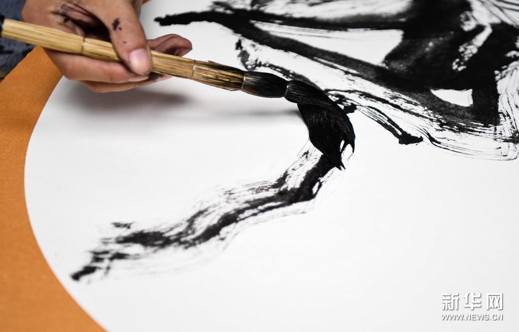 在广东江门市新会区的冈州画院,白沙茅龙笔制作技艺国家级非遗传承人张瑞亨用白沙茅龙笔进行绘画创作(3月24日摄)。新华社记者 邓华 摄