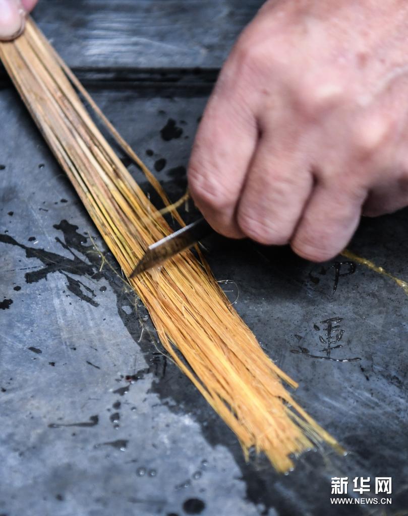 在广东江门市新会区的冈州画院,白沙茅龙笔制作技艺国家级非遗传承人张瑞亨对制作白沙茅龙笔的原料茅草进行刮锋(3月24日摄)。新华社记者 邓华 摄