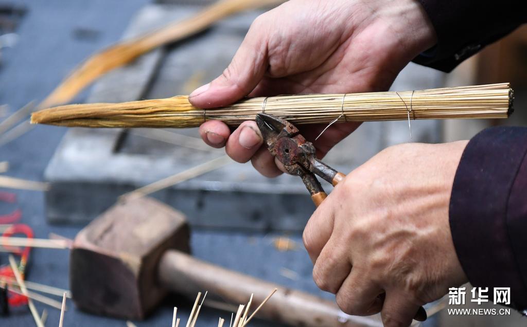 在广东江门市新会区的冈州画院,白沙茅龙笔制作技艺国家级非遗传承人张瑞亨对白沙茅龙笔进行绕扎,笔已初步成形(3月24日摄)。新华社记者 邓华 摄