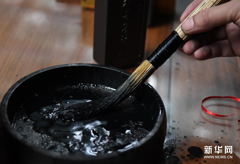 在广东江门市新会区的冈州画院,白沙茅龙笔制作技艺国家级非遗传承人张瑞亨用白沙茅龙笔蘸墨汁(3月24日摄)。新华社记者 邓华 摄