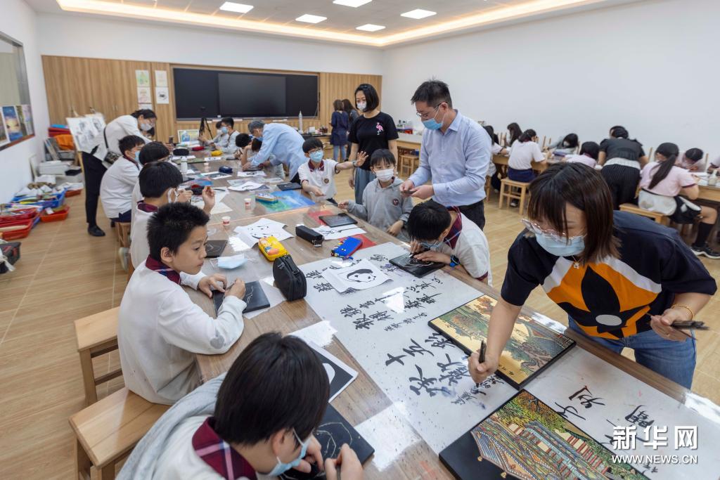 5月11日,上海台商子女学校学生在学习刻漆技艺。新华社记者 王翔 摄