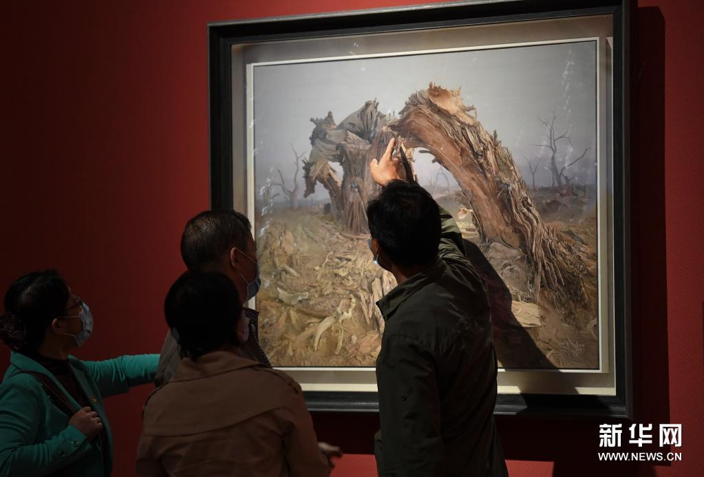 5月21日,参观者在新疆美术馆展厅欣赏画家李万云的油画作品《时光永恒》。新华社记者 王菲 摄