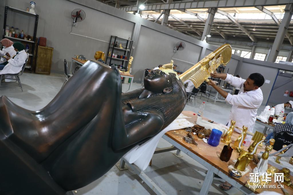 5月25日,工作人员在位于埃及盖卢比尤省的科努兹埃及文物复制品工厂给文物复制品上色。新华社发(艾哈迈德·戈马 摄)