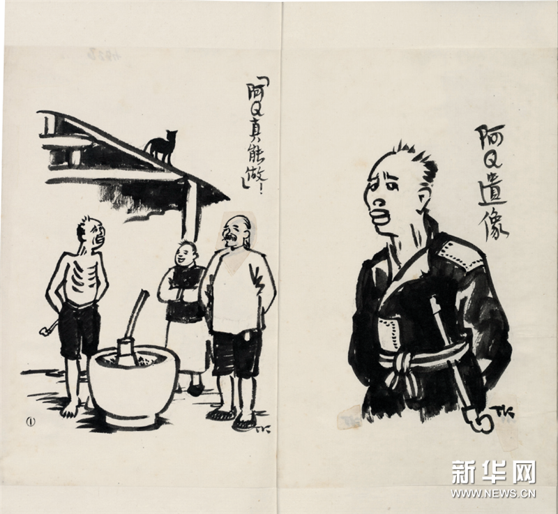 《阿Q正传》,丰子恺,徐调孚捐赠。此稿取材于鲁迅先生的名作《阿Q正传》,最初以《漫画阿Q正传》为题,于1939年由开明书店出版。本稿笔法简单拙朴,具有丰子恺漫画独特的淡淡的幽默感,且寄予了画者深沉的同情与悲哀,使读者在莞尔的同时又感到悲凉。