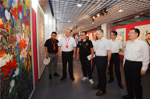艺术家刘庆广向观展嘉宾介绍其作品《盛世荷》