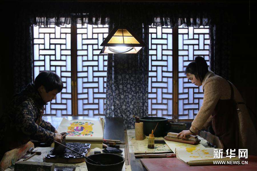 1月8日,在湖南省邵阳市隆回县滩头镇福美祥年画作坊,滩头木版年画艺人在印制滩头年画。新华社发(曾勇 摄)