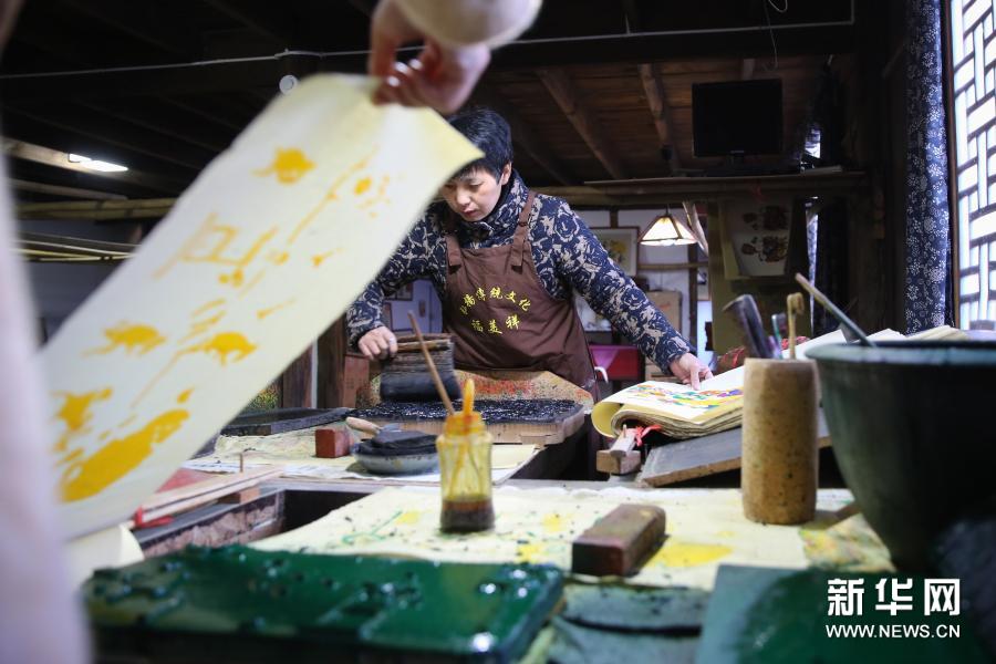 1月8日,在湖南省邵阳市隆回县滩头镇福美祥年画作坊,滩头木版年画艺人尹冬香在印制滩头年画。新华社发(曾勇 摄)