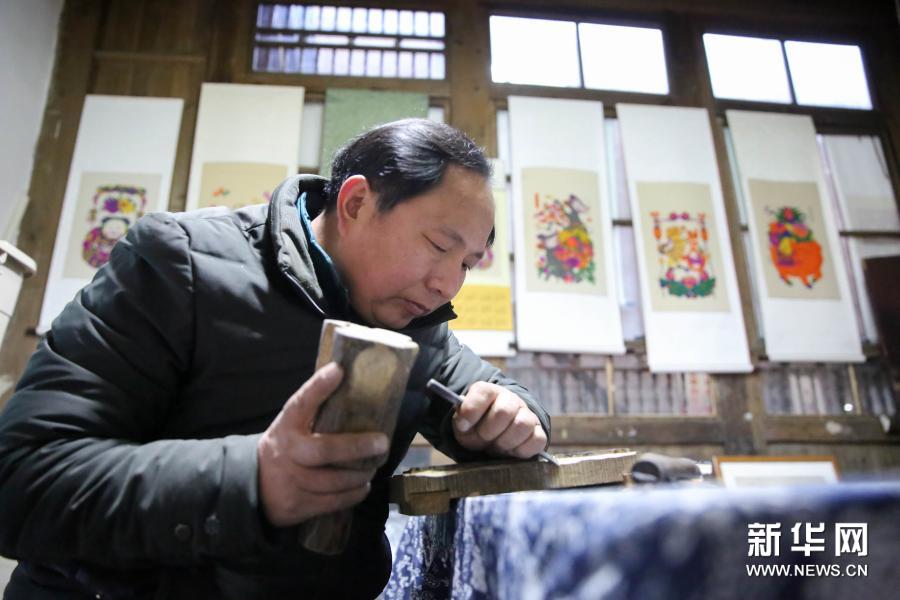 1月8日,在湖南省邵阳市隆回县滩头镇福美祥年画作坊,滩头木版年画代表性传承人刘国利在雕版。新华社发(曾勇 摄)