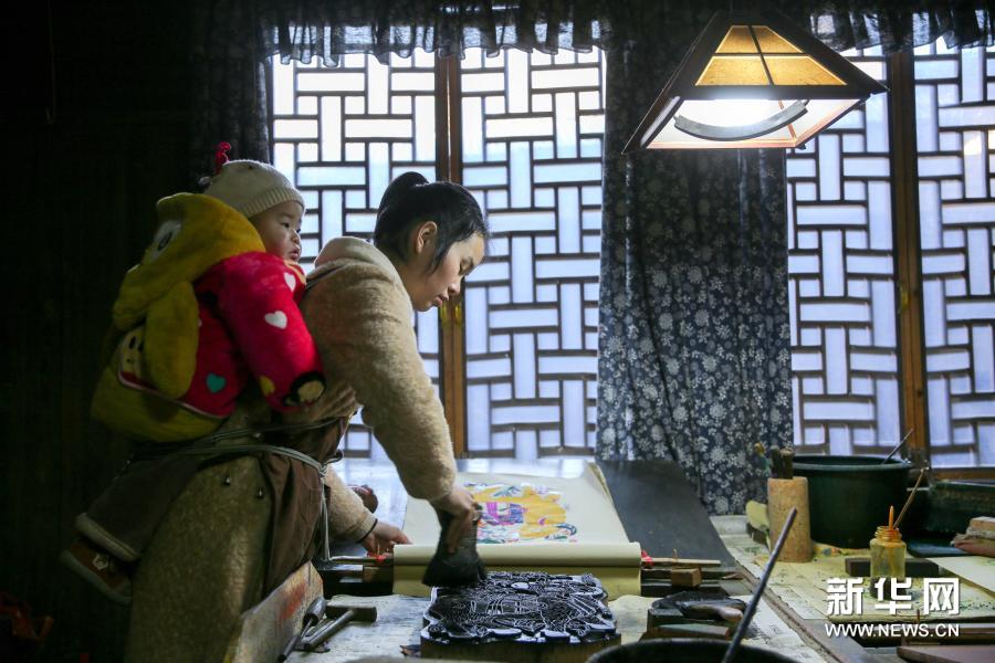 1月8日,在湖南省邵阳市隆回县滩头镇福美祥年画作坊,湖南滩头木版年画艺人肖扬背着女儿在印制滩头年画赶订单。新华社发(曾勇 摄)