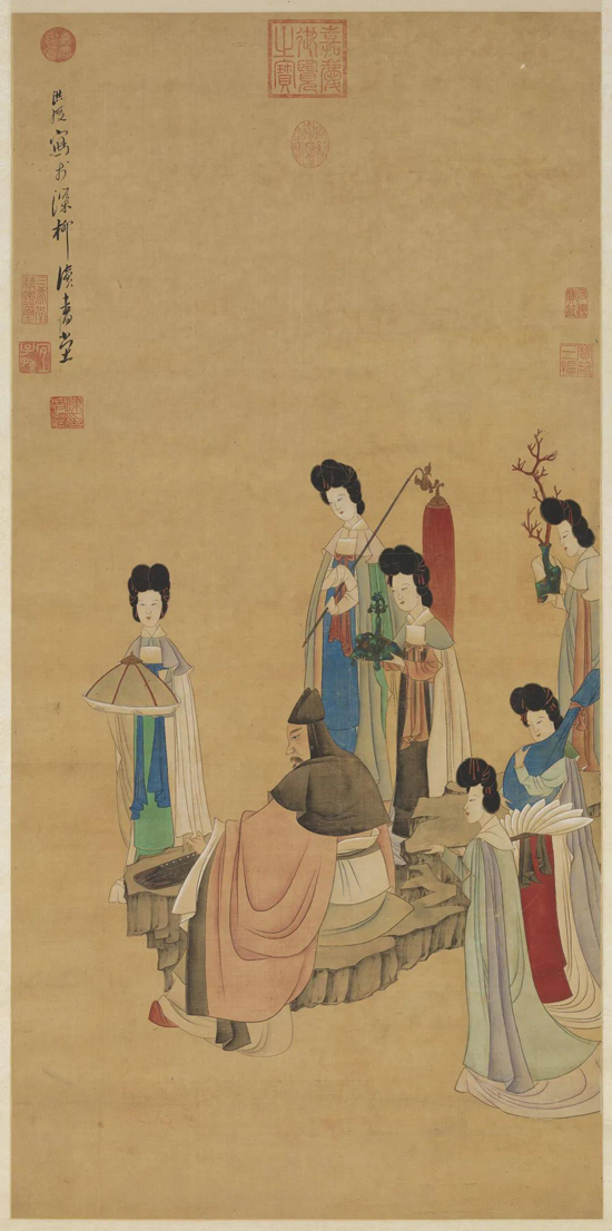 这幅人物画是陈洪绶的经典风格,线条细劲。画面上的士人巾服坐磐石抚琴,仕女六人侍立三边,由前至后,一捧盘,一执红拂,一捧香炉,一捧内插珊瑚的古瓶,一抱阮,一持白羽扇。