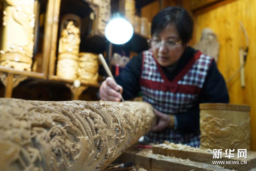 2月28日,在贵州省赤水市石沓沓非遗馆,卢华英进行竹雕创作。新华社发(张鹏 摄)