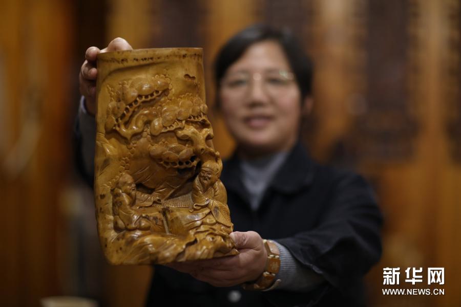 2月28日,在贵州省赤水市石沓沓非遗馆,卢华英在展示自己制作的竹雕工艺品。新华社发(王长育 摄)