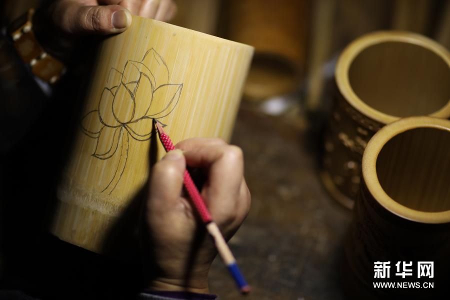 2月28日,在贵州省赤水市石沓沓非遗馆,卢华英在竹筒上绘制将要雕刻的图案。新华社发(王长育 摄)