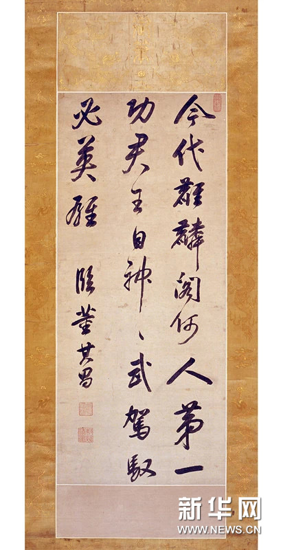 沈阳故宫馆藏“清玄烨临董其昌行书诗轴”洒金蜡笺绫本。右上引首钤篆文白文“渊鉴斋”长圆印,行书写诗一首,全诗为:“今代麒麟阁,何人第一功。君王自神武,驾驭必英雄。”诗后署款“临董其昌”,下钤篆书朱文“康熙宸翰”“敕几清宴”二方印。