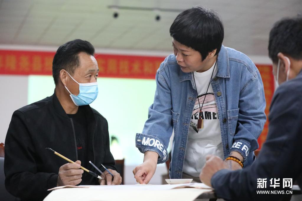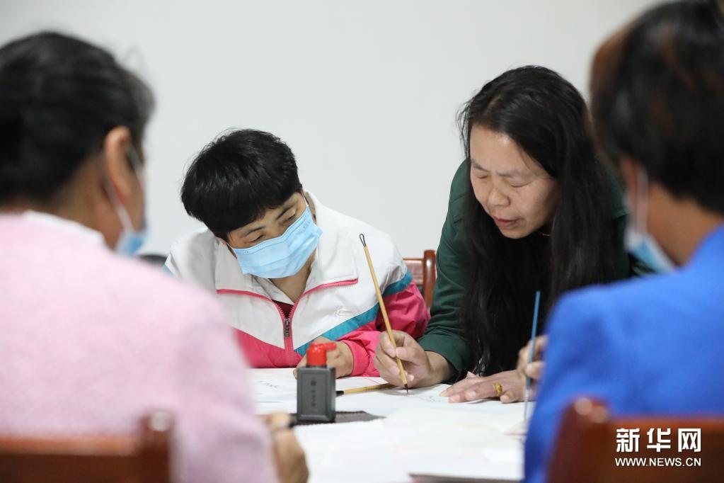 5月16日,在河北省邢台市隆尧县魏家庄镇西庄头村村民文化活动中心,培训老师在指导残疾学员工笔画技艺。新华社记者 骆学峰 摄