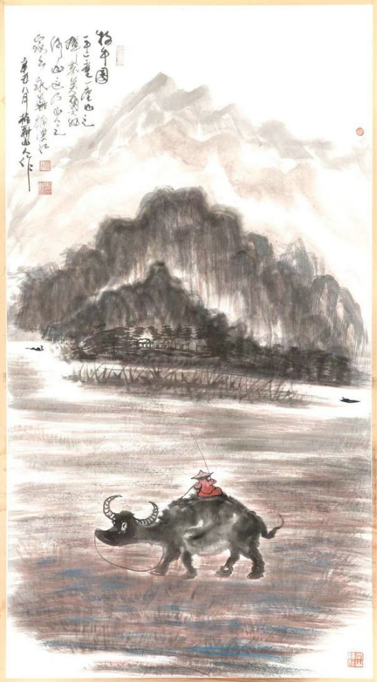 朱祖国是一位演绎经典与当下的画家,纵观他的作品,发现画家的演绎经典与当下的同时,还融入了许多个人的文化元素,有其独特的文化见解,这在当今之画坛是很突出的,给人印象很深的一幅经典的《山水牛闲图》。