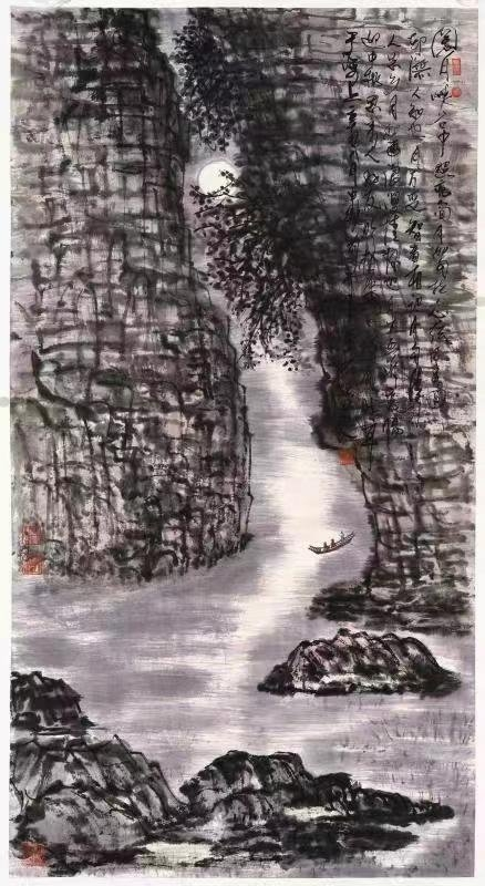 横观此幅《山水牛闲图》创作笔法,其一脉相承着朱祖国先生大写意山水的笔法脉络,他将中国山水画的“三远法”应用自如得法,使得画中的远山、近水的透视达到最佳效果,几头惬意闲趣的耕牛让整幅画面充实了生活的情趣。我们说一幅尚好的有生活气息气的山水画指的是在画中,可以是几种不同的透视角度,表现景物的“高远”、“深远”、“平远”。北宋中期的郭熙在《林泉高致》中说山有三远:自山下而仰山巅谓之高远;自山前而窥山后谓之深远;自近山而望远山谓之平远。中国山水画往往在一幅画中有“高远”让你体会山峰的雄健,感到山势逼人,而近景又能展现生活。朱祖国先生此画气势有高度,用笔有力度,线条流暢疏散自如,章法得体。我们常说中国画难在韵味更难在个性的艺术表达方式及特定的绘画语言,此画让我们欣喜地领略、品鉴了朱祖国先生之山水画的韵味、个性及粗狂有度之风格,期盼能看到他的更多佳作呈现在百花争艳的画壇之中……