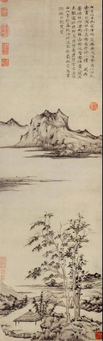 一河两岸,彼岸世界渺如云汉,但眺望者就是不愿意放弃心中的求索。南田认为,云林画中有一种欲罢不能的意味,这是很有眼光的。云林一河阻隔中的两岸,构成了巨大的张力世界。