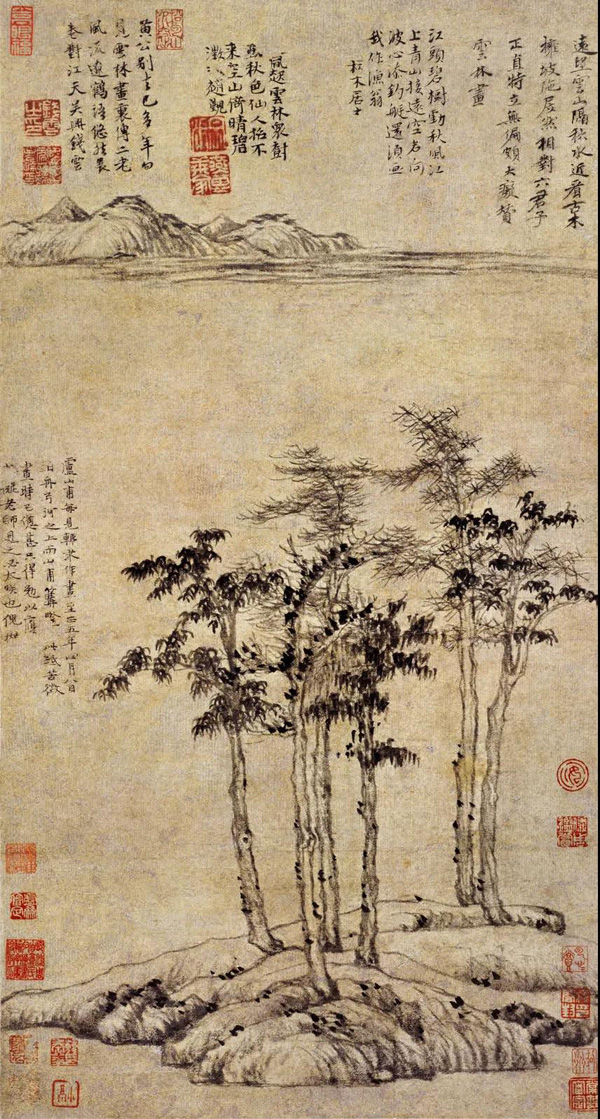 元 倪瓒 五株烟树图页 纵73.2cm 横54.6cm 故宫博物院藏