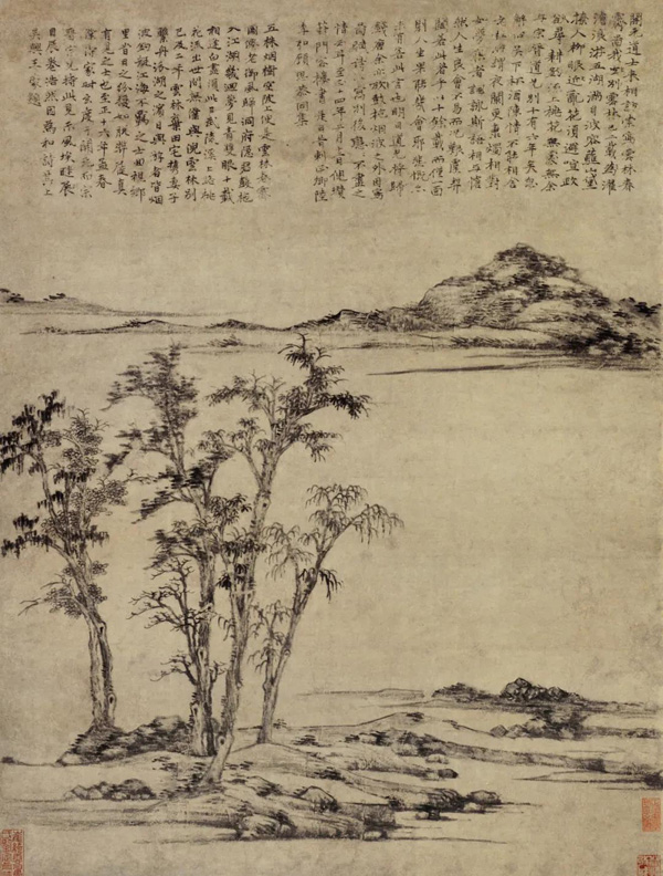 将繁复的形式凝结在简括表达中,有意约束自己,控制笔墨,这是技术性斟酌。画面空空,让四面来风,追求空灵的韵味,这也是庸人的做法。云林的简,香山翁发明的简,乃是性灵中的平淡本真。不是有意简化形式,制造空灵,只是适意表达而已。换句话说,他并没有什么东西需要“简”化、需要“减”去、需要“舍”得。有“得”的欲望,永远不可能有真正的“舍”,真正的“舍”是—并无可舍处。“只画一两楹,点缀冥漠间”,云林将人的存在命运放到“冥漠”—超越时空的寂寞世界里,见出一种窘迫,也含有一种回旋,有凄婉的跌宕,也有优游中的从容。