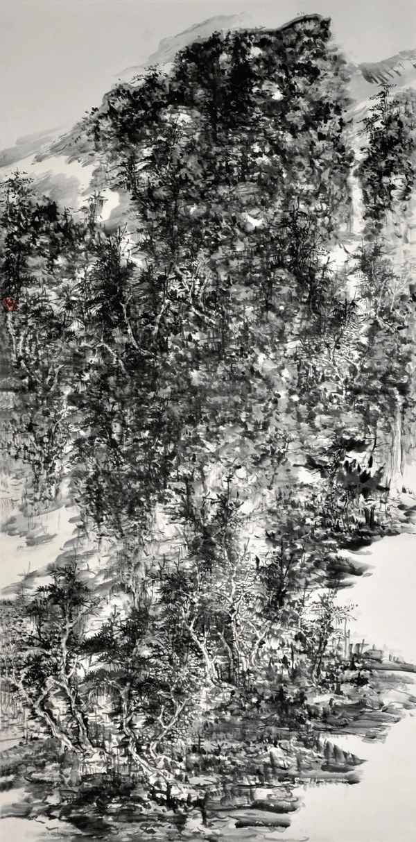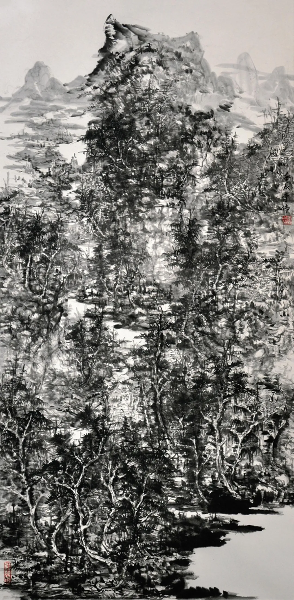 我站在他创作的苍松劲柏长画前血脉偾张、情绪昂扬,试图寻找到静谧、雄强、苍劲精神风骨之奥妙……我想,这些皇皇巨作是他天赋、勤奋和艺术功力的自然生发,也是他生活阅历、人生历练、艺术生命的耀眼光泽。他尊崇古法,以传统笔墨为源。他是从正规美术学院走出来的艺术才俊,长期从事高端美术编辑、美术活动组织、美术作品评审等工作,组织美术精品到基层、连民心。他认为, 对传统最好的继承就是师从古法、融会贯通,由浅及深、由表及里地学习领悟,感受精髓要义,吐故纳新,不断进行现代化的探索创新。他向历史典藏学习,拓展跨度,悉心感受史前彩陶、商周青铜器、隋唐石雕、宋元明以来的写意画、明清版画,理解先贤圣哲创造象形与象意相融合的审美理念;向美术经典学习,提升高度,从青绿重彩的《游春图》,到浑厚高远的《富春山居图》《庐山高图》等;从黄宾虹苍润浓厚的绘画语言、细腻华滋的审美意境,到傅抱石“师古人之心,不师古人之迹”的艺术法则,悉心掌握艺术创作规律;向身边名家学习,开掘深度,十几年乐为众多艺术家做“嫁妆”,精心编辑无数美术典籍,认真组织许多大型展览,经他编辑、遴选的美术作品不计其数,临摹过的传世经典也已等身。他倘佯在丰富多彩的艺术实践中,博采众长,千锤百练,熔铸了敏锐艺术眼光和极高标准,悟透经典的意、境、神、韵,做到学习传统而不囿于传统、借鉴他人而超越他人,使绘画艺术从内容到形式、从构图到造型、从笔墨到色彩都达到很高水准。